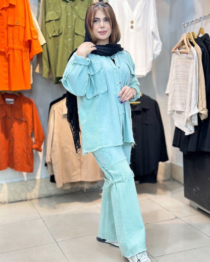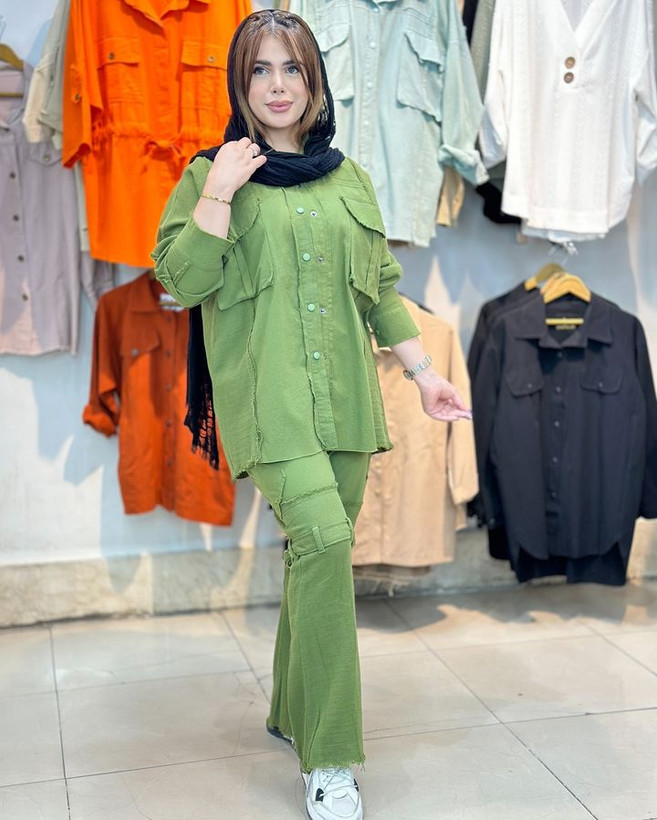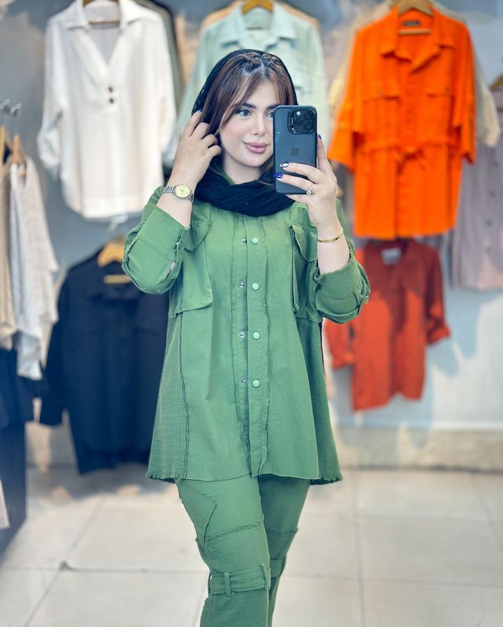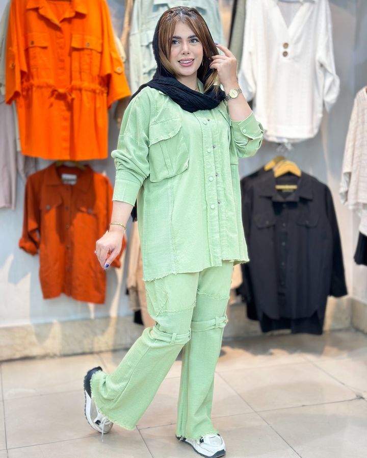 ست شومیز و شلوار یکی از ترندترین ایتم های فصل میباشد و بسیار پرطرفدار و جذاب است قد شومیز ۷۵ و قد شلوار ۱۰۰می باشد. بسیار راحت و شیک برای استفاده روزمره ومسافرت است.جنس کارترکیبی لینن درجه یک و انزیم شده و پارچه کنفی میباشد . مناسب سایز ۳۸ تا ۴۴ می باشد.دو جیب کاربردی روی شومیز کار شده و در فسمت زانو یک کمربند جذاب کار شده است