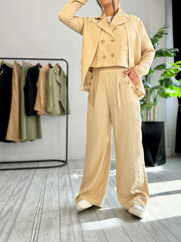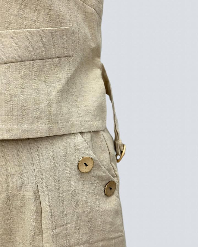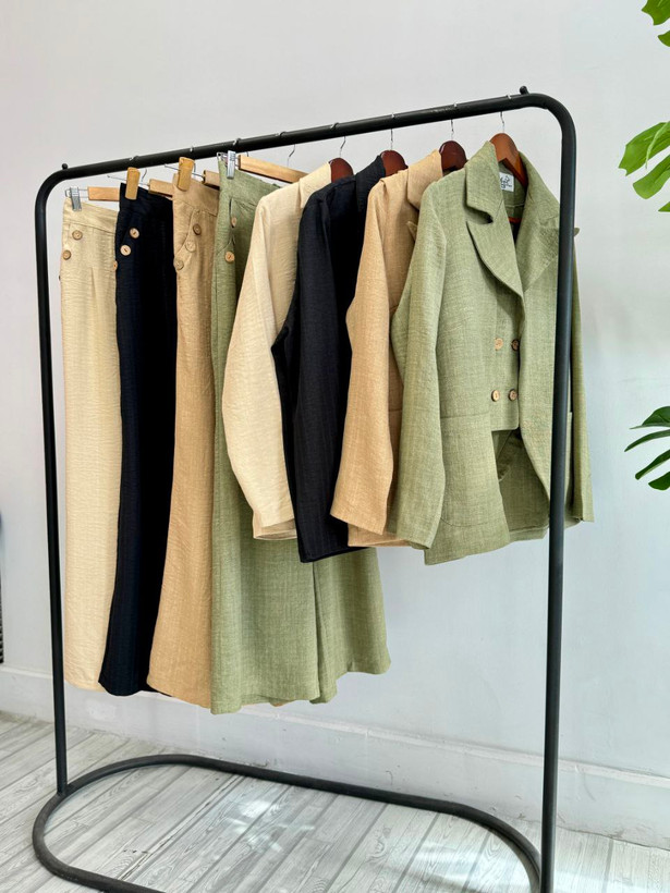 دیدن محصولات مرتبطست ژیله و کت و و شلوار از جنس لینن ژاکارد درجه یک و فوق العاده با کیفیت با تنخور عالی یک استایل جذاب برای افراد خوش استایل می باشد .قد ژیله 60 سانت و قد شلوار 100 و قد کت 75 میباشد. ژیله کار با دکمه بسته می شود ویک کمربند بذای تنظیم سایز روی آن کار شده است . یقه ژیله انگلیسی می باشد.روی کت و شلواردو جیب کاربردی کار شده است . شلوار بصورت واید طراحی شده که ترند امسال می باشد.