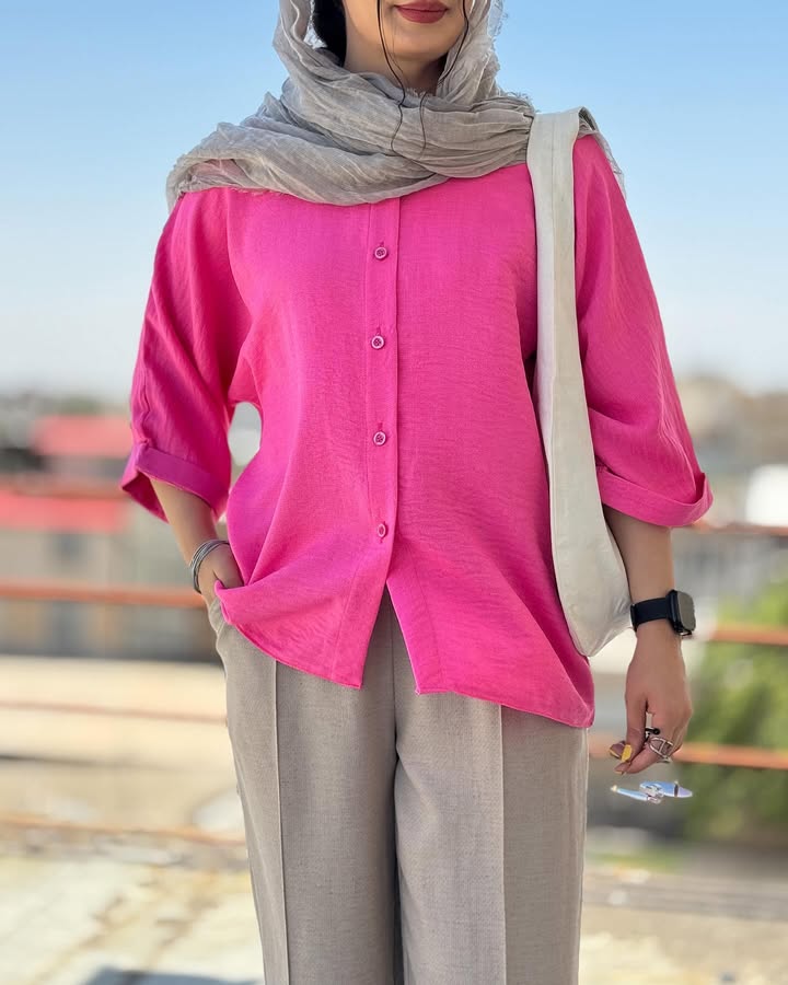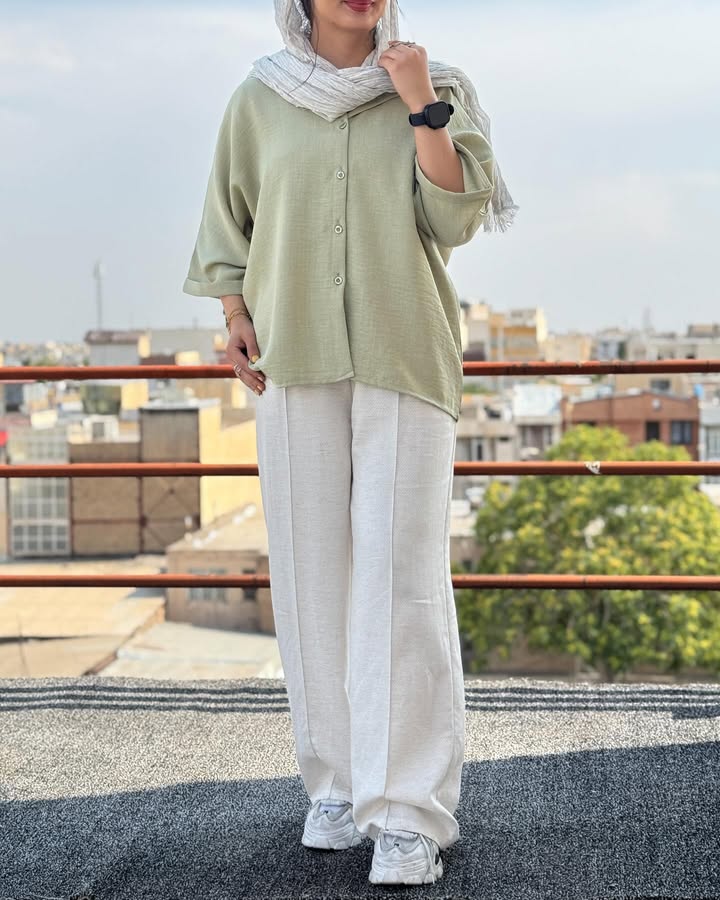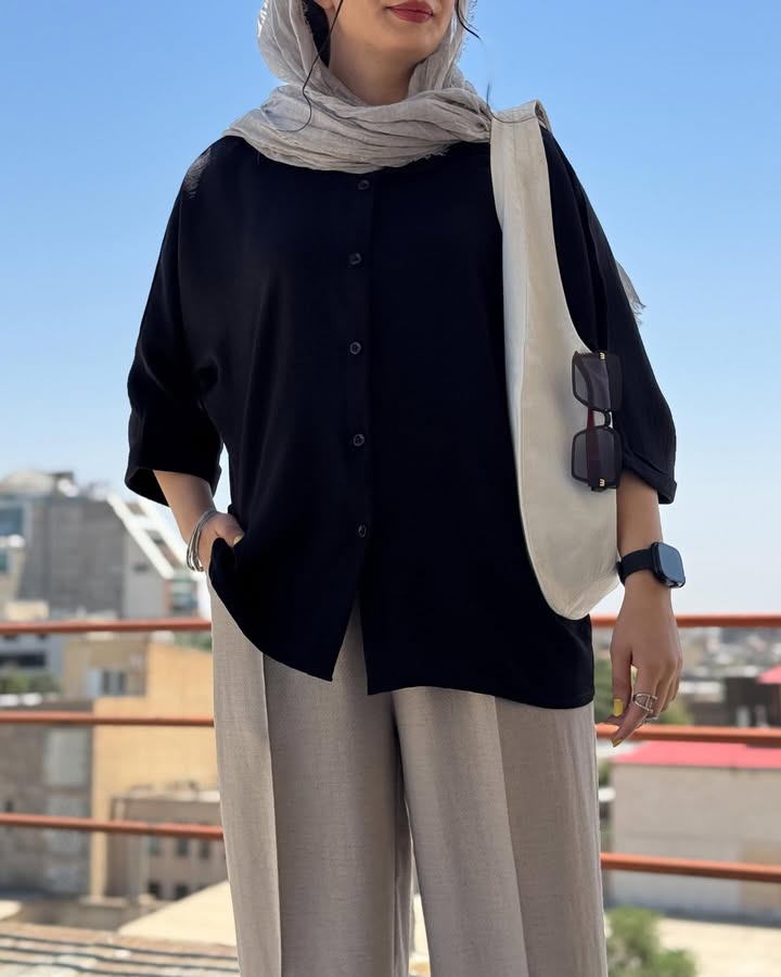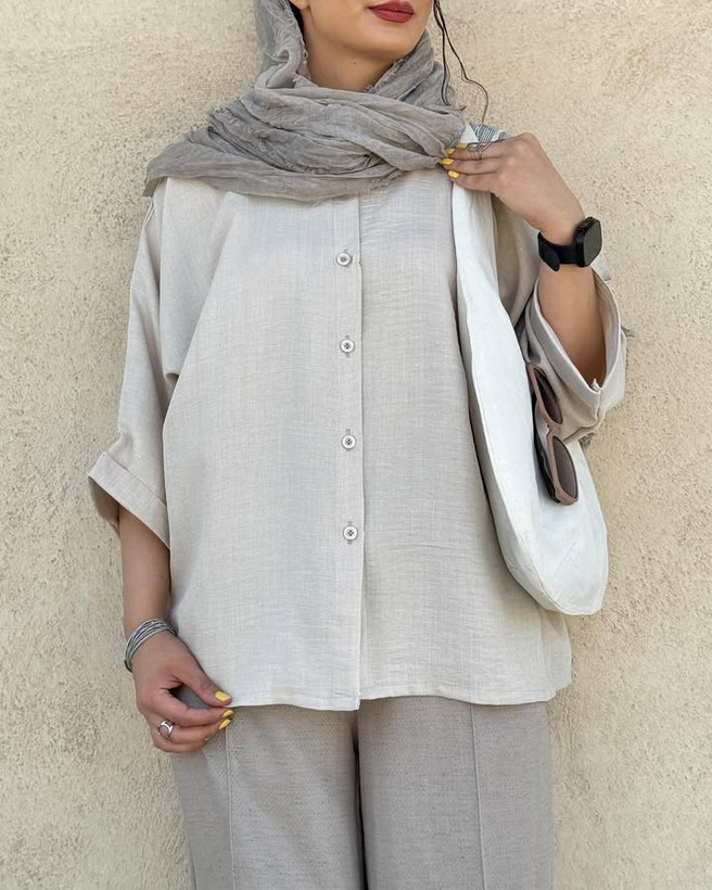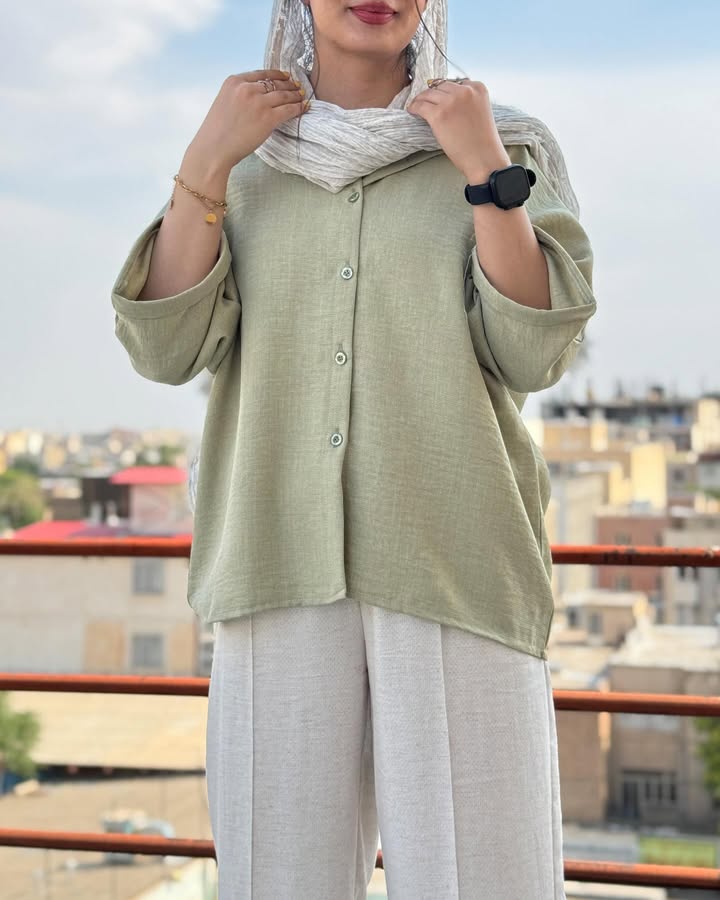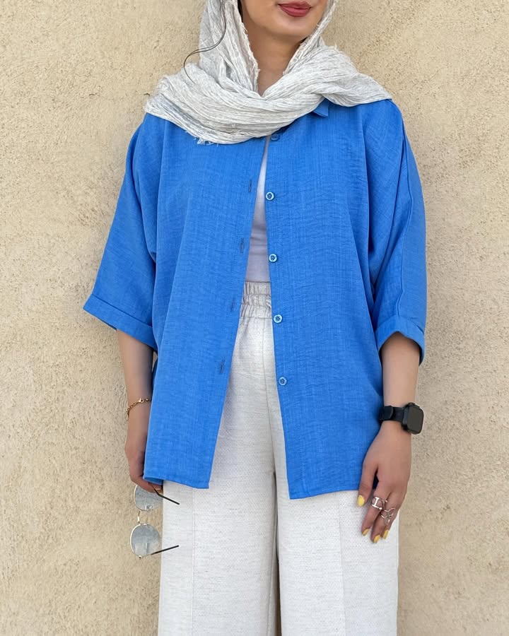 مانتو شومیزی از جنس آرمانی درجه یک ومناسب فصل قد شومیز حدود ۷۰ سانت فری سایز مناسب سایز ۳۸ تا ۴۲ می باشد.جلوی مانتو با دکمه بسته می شود. یقه کار بصورت مردانه طراحی شده است .استینکار بصورت سه ربع میباشد و لبه استین پاکتی استایل شده است.